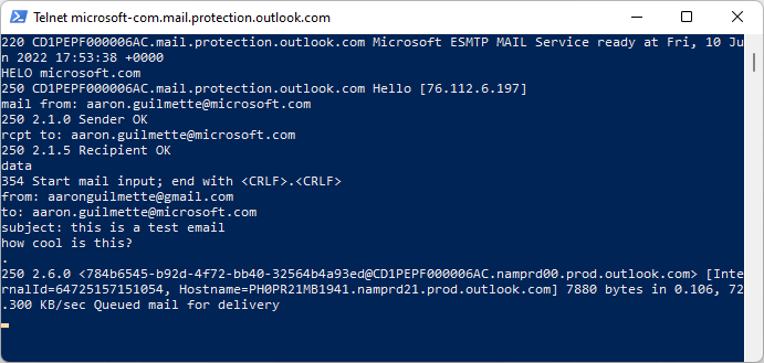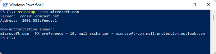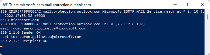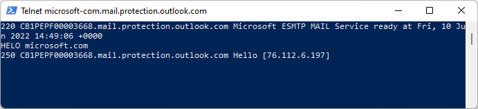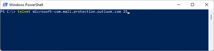 1. First, you need to locate the MX host of a recipient’s domain (the easy way to do this is to use your own domain).  From either a PowerShell (my preferred) or CMD prompt, run: