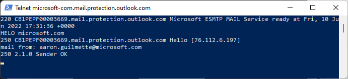 3. You need to introduce yourself.  Use either the HELO or the EHLO command to do so.  EHLO is an enhanced or extended hello, which introduces additional verbs that can be used.  You can use either, but since we’re not using any advanced features, you can just go for the standard HELO.  The syntax is: