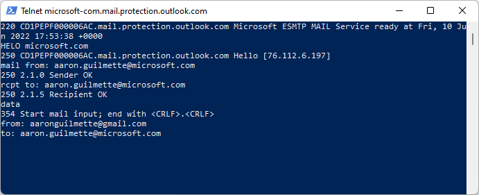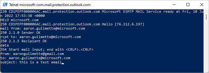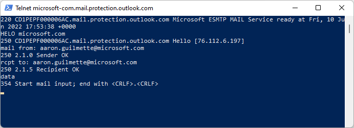 6. Next, you need to use the DATA verb.  This is instructing the SMTP server that you’re going to be sending content.