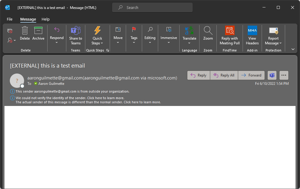 The message I received has a whole bunch of interesting tooltip notifications, indicating that the sender may not be who they claimed to be (from a domain perspective) and that the message originated from outside the organization: