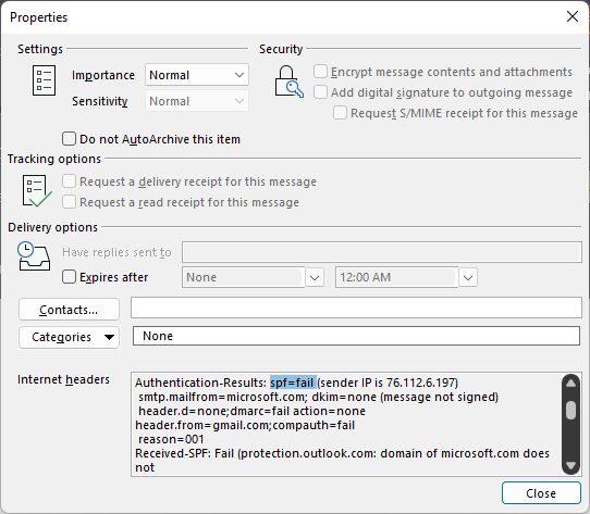 Viewing the header properties of the message gives some additional cool info. We’ll dig into it in another post.