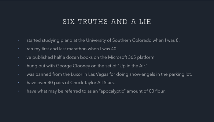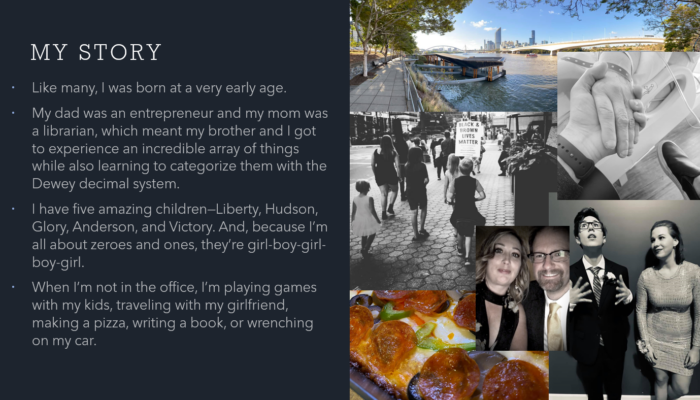 This one’s pretty basic–it’s really setting the stage for what the presentation is going to look like. In my case, I highlight both professional and personal attributes in a way that telegraphs to the reader what kind of a ride they’re in for.