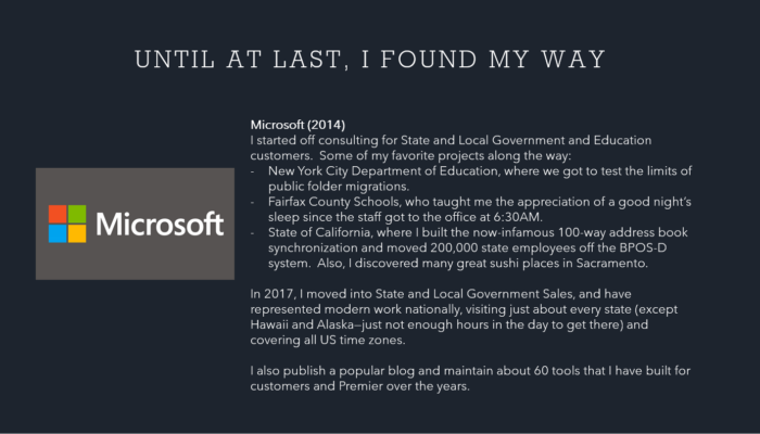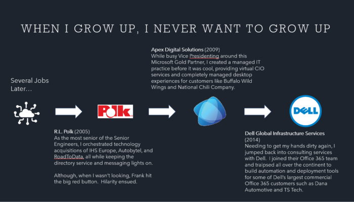 Many of us have shared, relatable experiences in our first jobs, so I don’t provide a whole lot of detail here. I personally find it beneficial to use some of these early jobs to establish a connection with the audience.