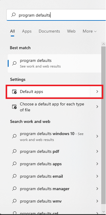 1. Click Start and search for Default apps.  We’ve changed the name a few times (previously calling it Program defaults, for example, which you can still use to search with successfully)).  Under Settings, select Default apps.