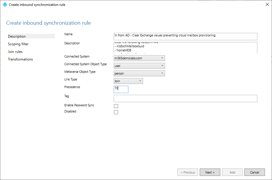 To prevent that from derailing our plans, I decided to put a rule in to prevent the msExchangeMailboxGuid from synchronizing to the new tenant (or wiping out any value that had already been sent in error).
