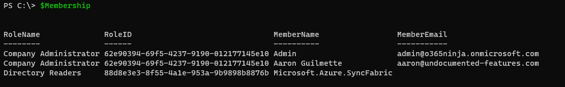 This will only list current directly-assigned members (or those with active PIM assignments). To look at eligible role members, we’ll need to use a different command. 🙂