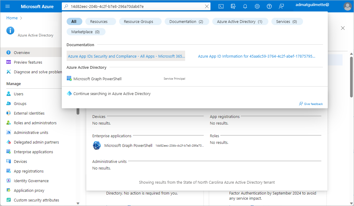 - Navigate to Azure AD portal (https://portal.azure.com) or the new Entra AD portal (https://entra.microsoft.com) and paste the app ID referenced in the error in the Search box itself, and then select Microsoft Graph PowerShell under Azure Active Directory (if using the Azure AD portal) or under Enterprise Applications (if using the Entra admin center).